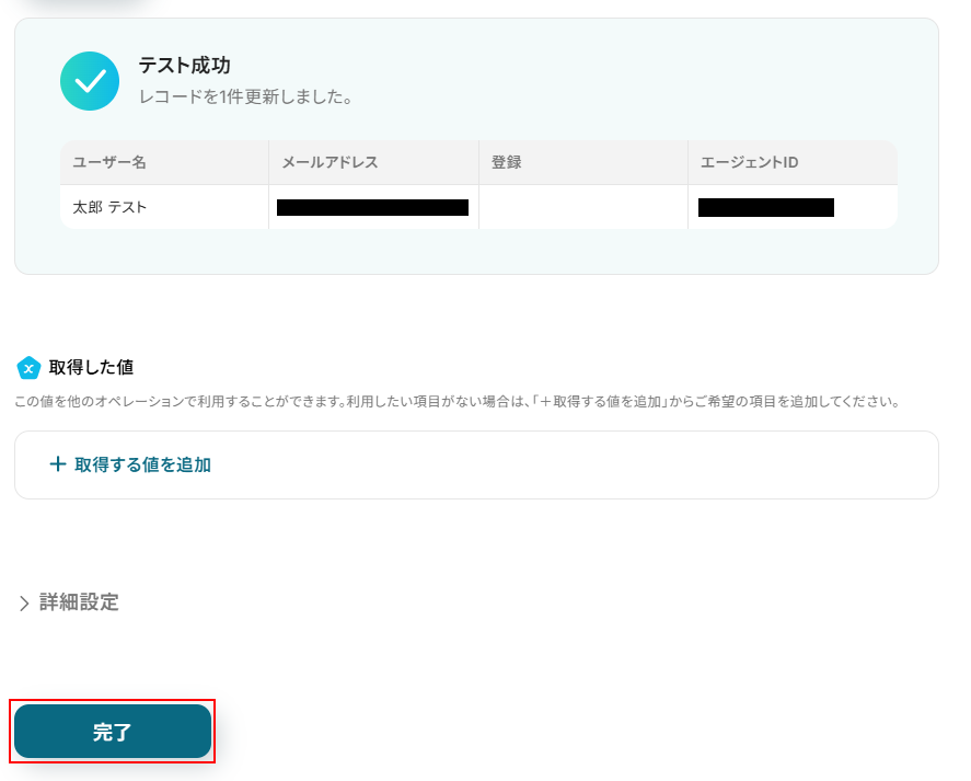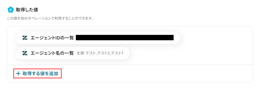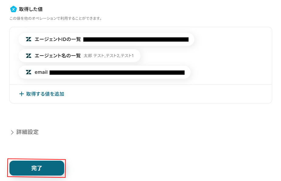 今回はデフォルトで設定されている、エージェントIDの一覧、エージェント名の一覧に加えてemailの情報を利用したいため、+取得した値を追加をクリックします。