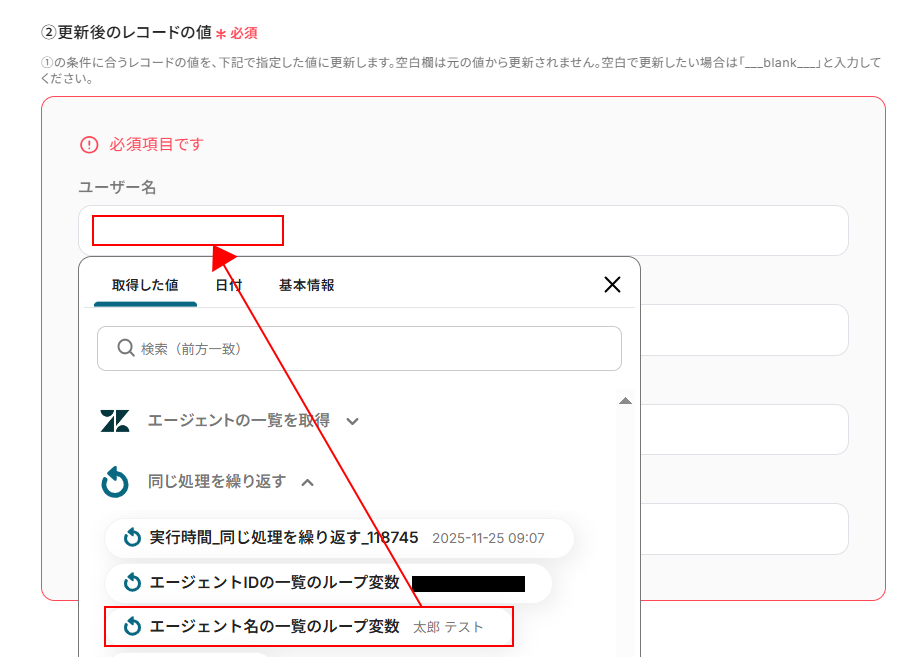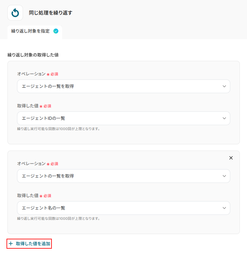 入力欄をクリックし以下のように、同じ処理を繰り返すの項目から〇〇のループ変数となっている取得した値を設定しましょう。