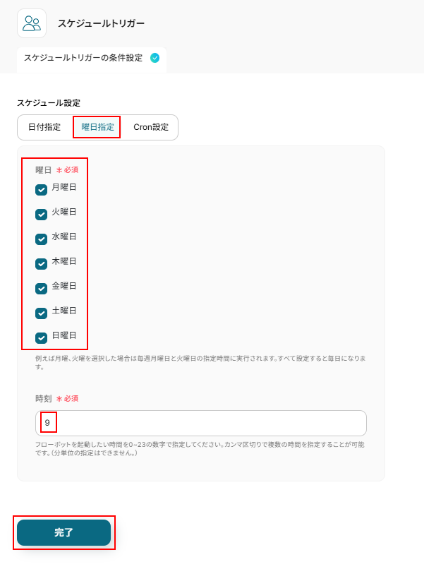 今回はデフォルトで設定されている曜日指定を使用し、毎朝9時に起動するように設定しました。