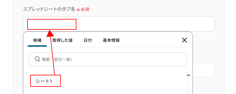 入力欄をクリックし、表示された候補の中から事前準備で用意したものを選択してください。