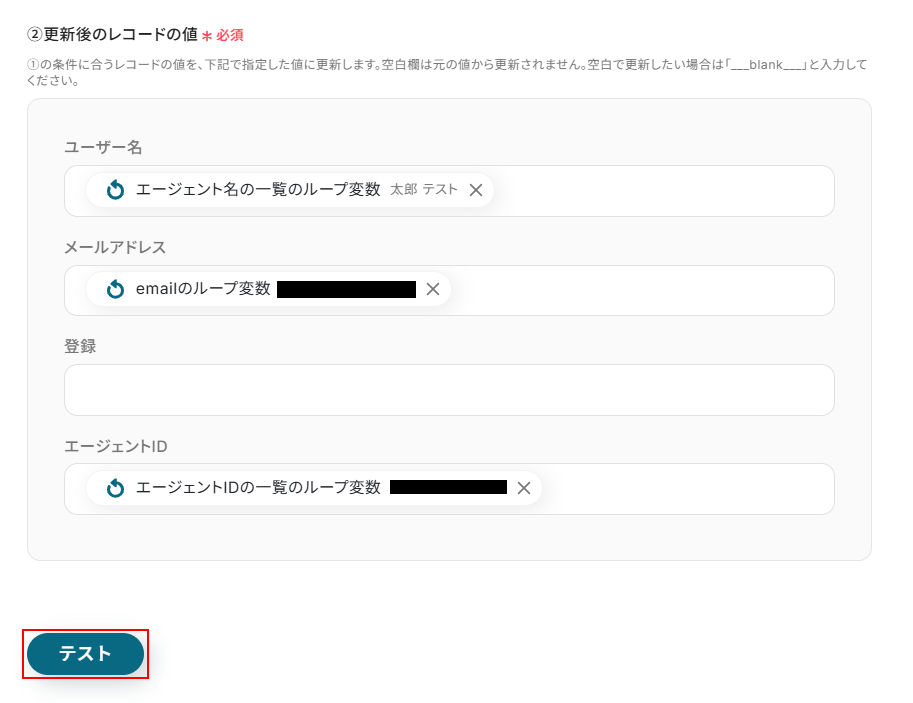 ※入力欄に直接記入することも可能ですが、入力した値が固定値となり、このテンプレートを通して更新される全てのレコードに適用されますのでご注意ください。
