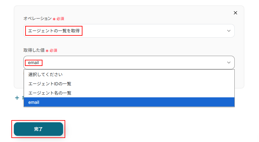 オペレーションにはエージェントの一覧を取得を、取得した値にはemailを選択します。