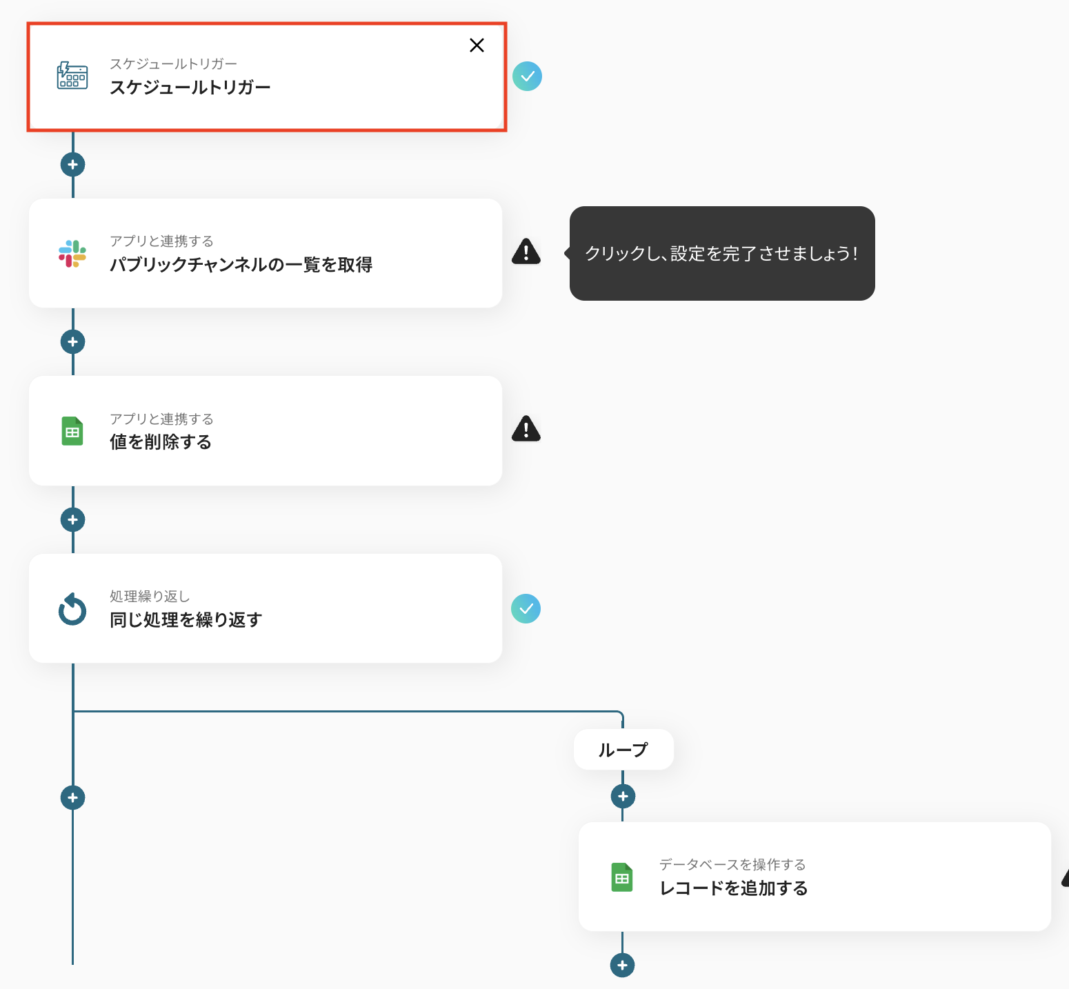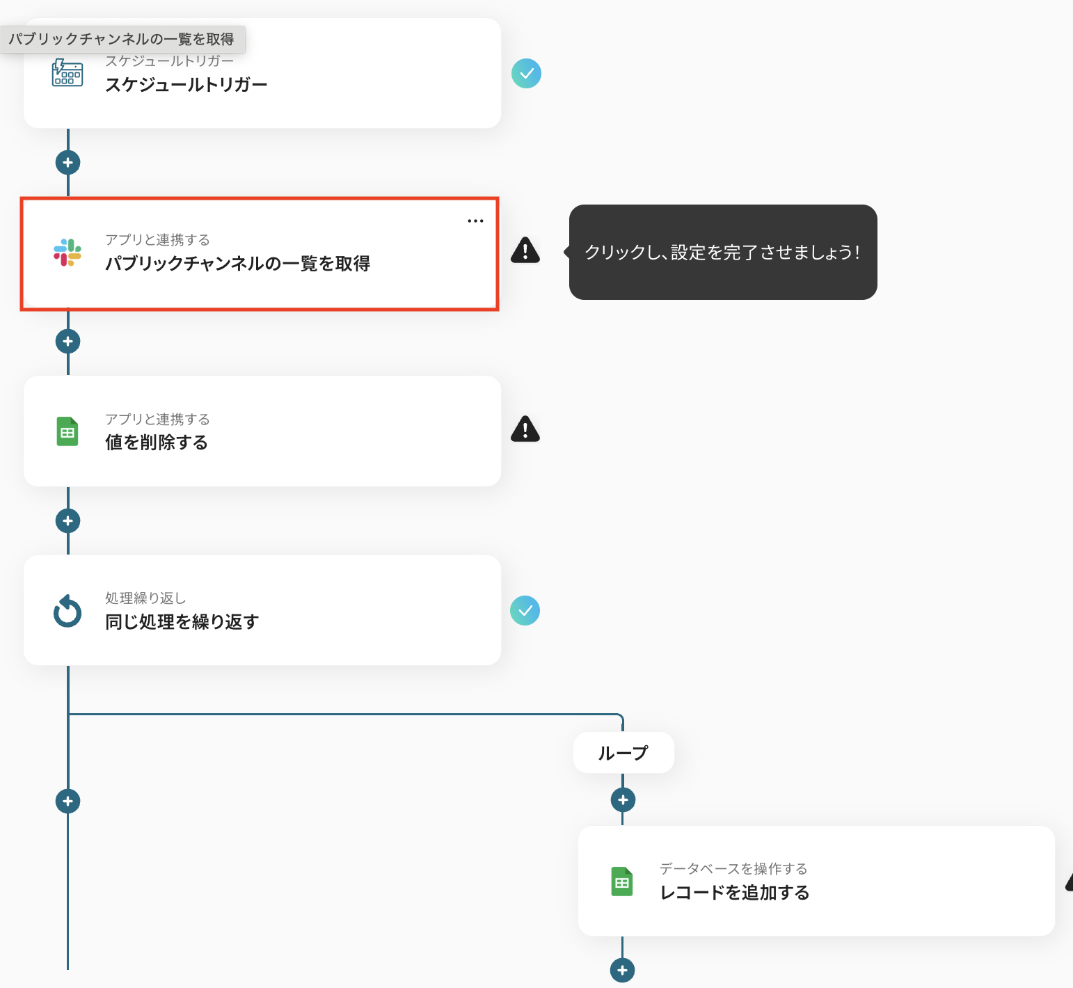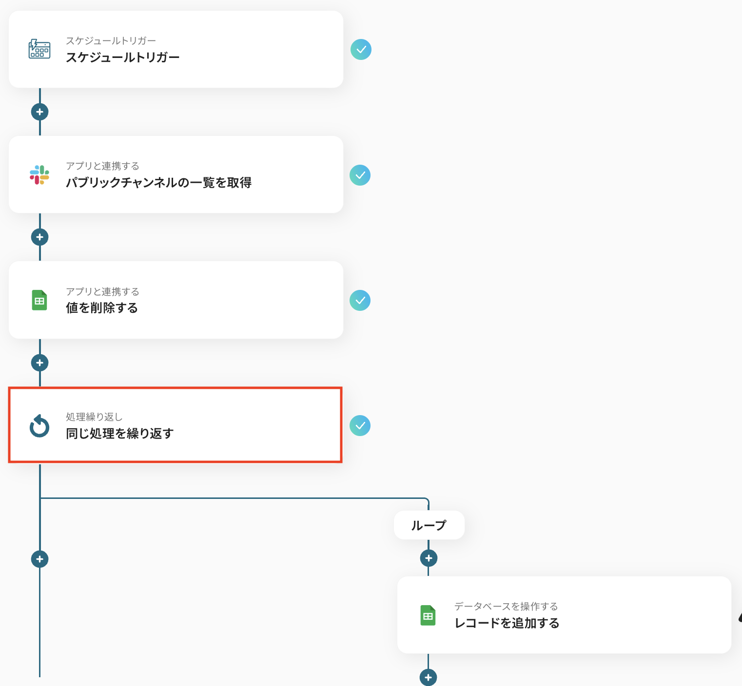 この設定によってトリガーのステップで取得した複数のSlackチャンネル情報を対象に、同じ処理を順番に実行できるようになります。