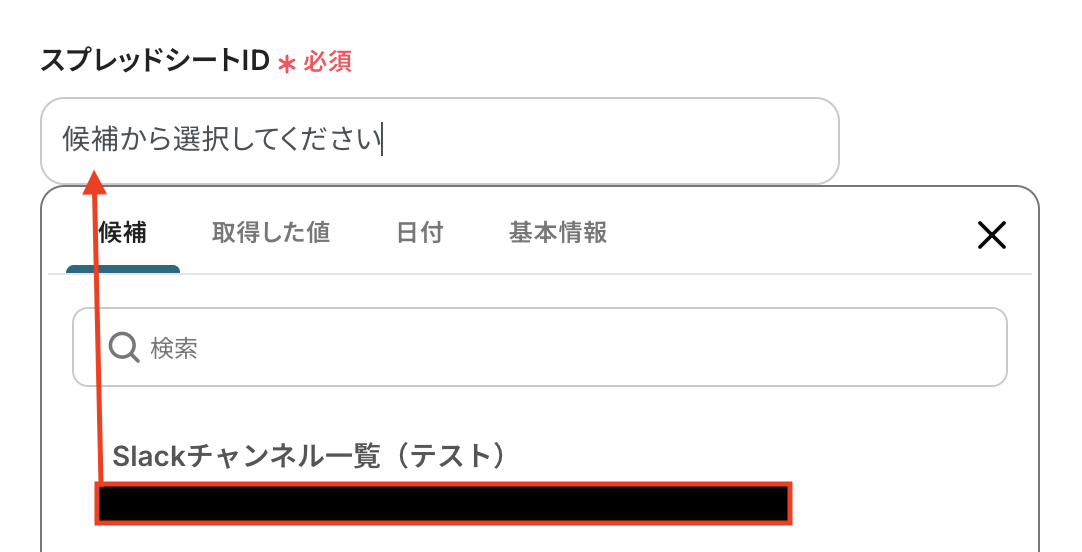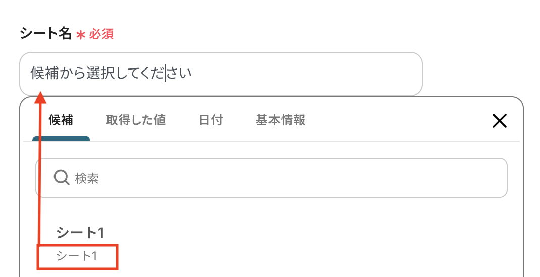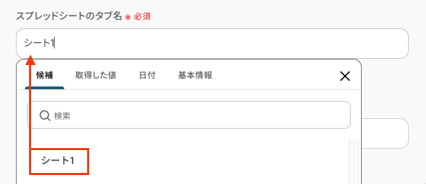 こちらも入力欄をクリックすると連携が有効になっているGoogle スプレッドシートからシートの候補が表示されるので、対象の項目を選択してください。