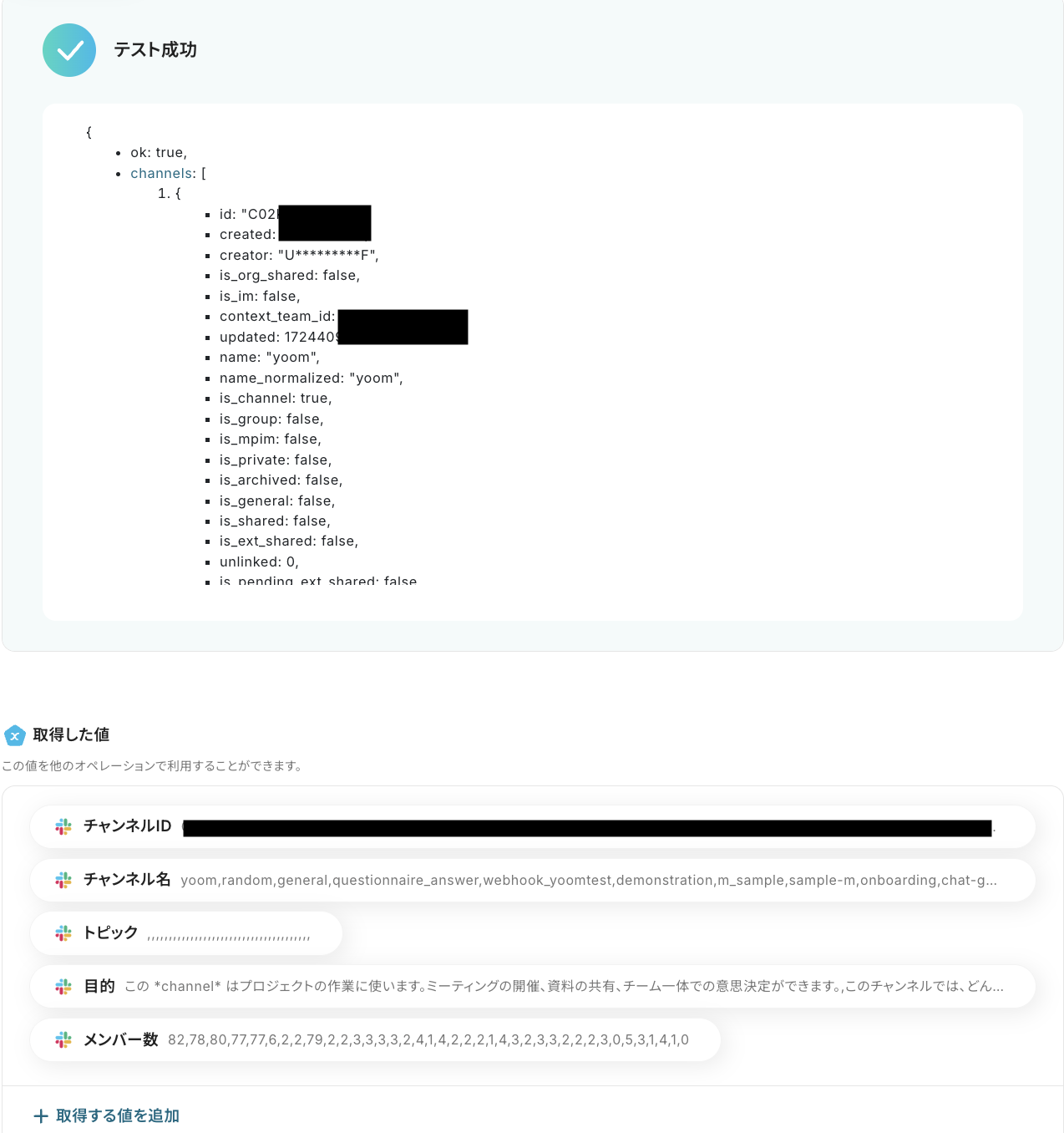 テストに成功すると、Slackで取得されたチャンネルの一覧情報が表示されます。