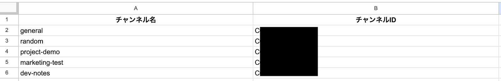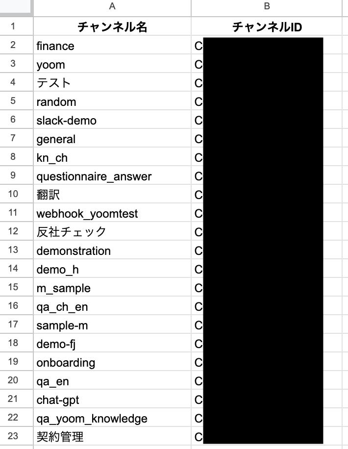 テストが成功し、フローボットをONにすると、指定したスケジュールに合わせてフローが自動的に実行され、Slackから取得した各チャンネル情報が1件ずつ順番にGoogle スプレッドシートへ記録されます。