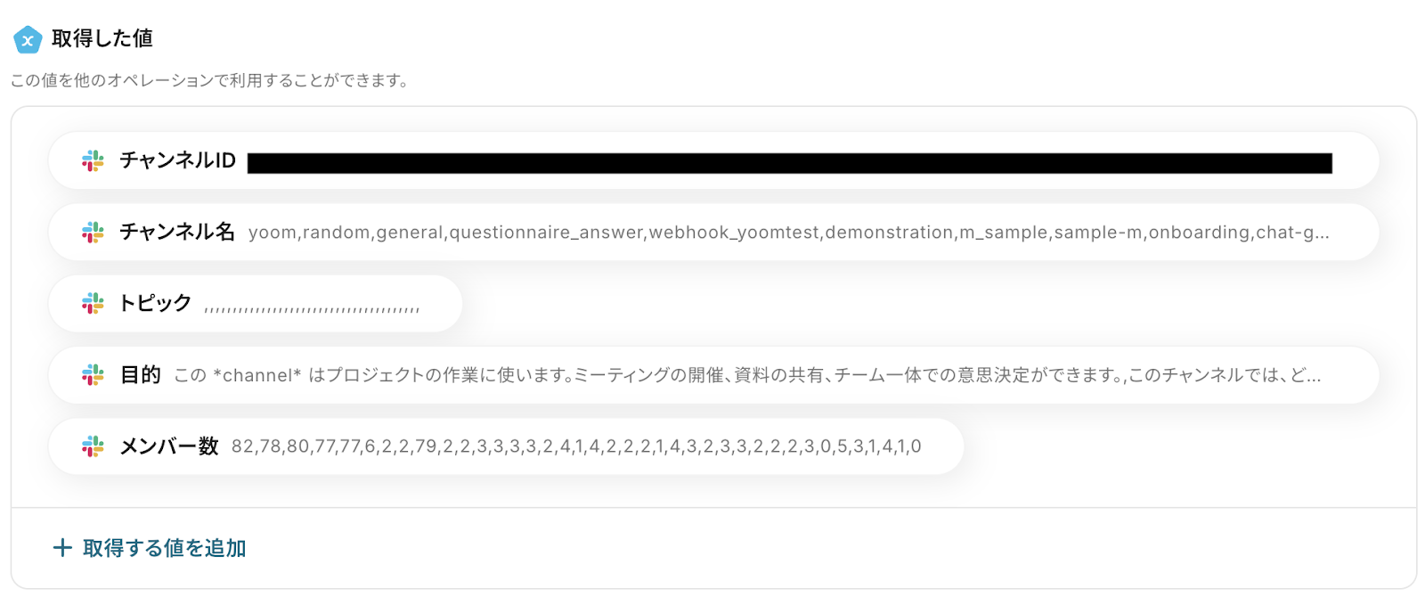 各オペレーションには「パブリックチャンネルの一覧を取得」を選択し、取得した値にはそれぞれ「チャンネルID」と「チャンネル名」を指定します。