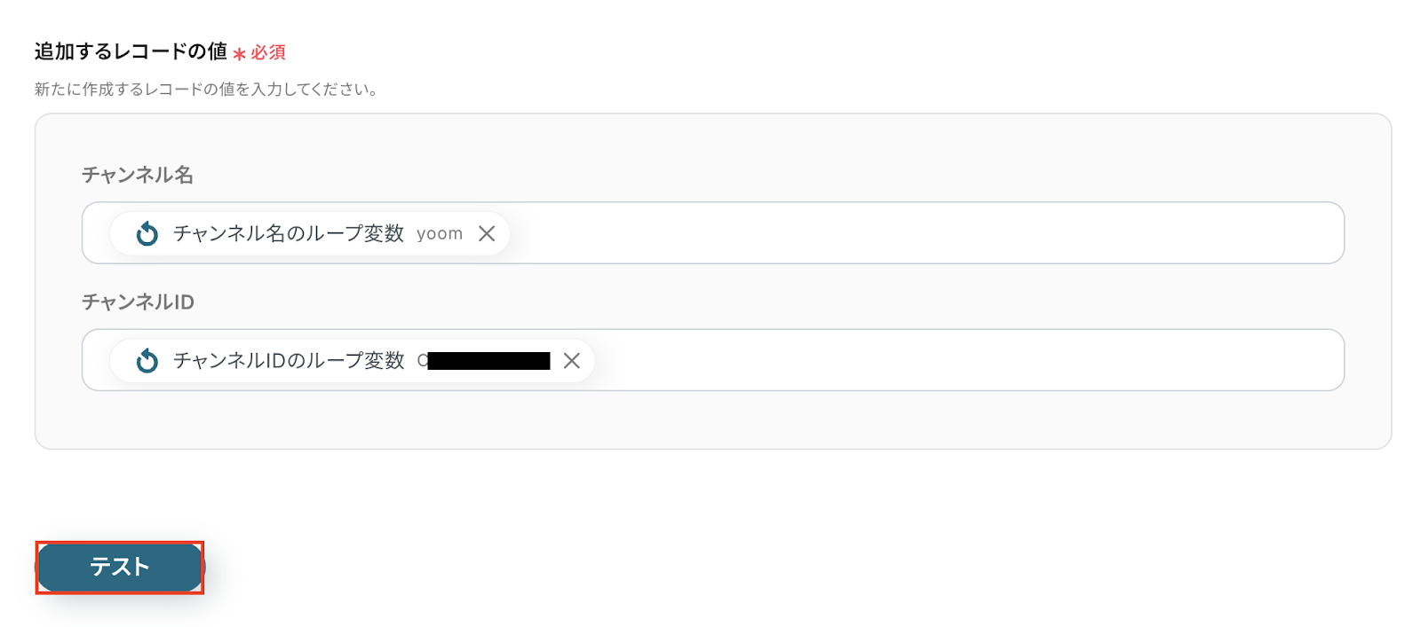 それぞれの項目について入力が完了したら、「テスト」をクリックして、設定した内容でGoogle スプレッドシートにレコードが追加されるか確認しましょう。
