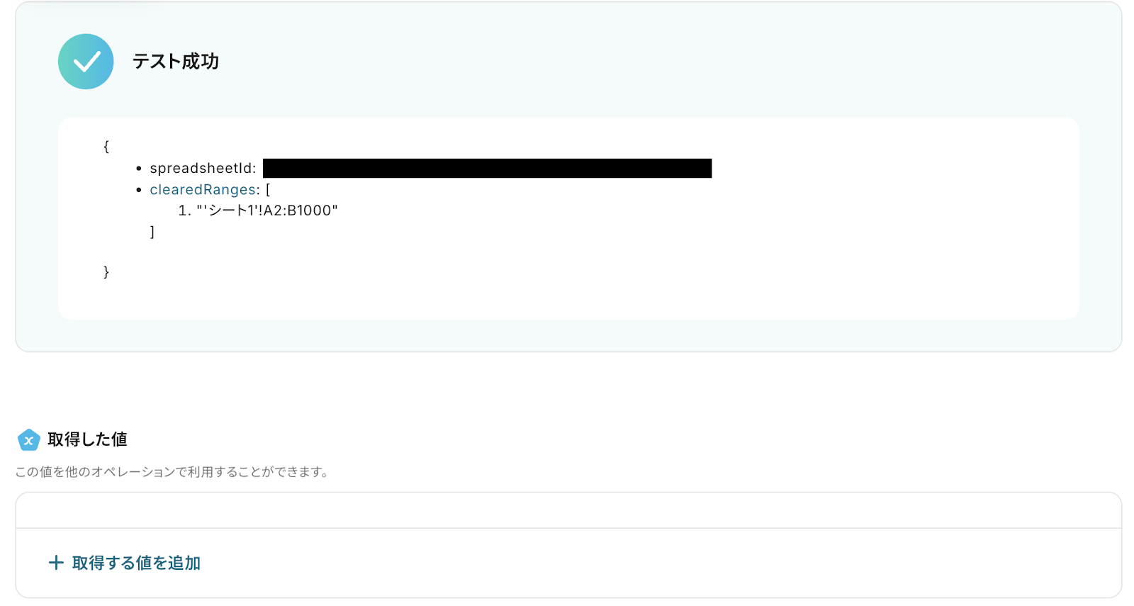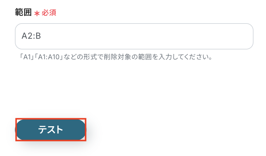 入力が完了したら「テスト」をクリックして、設定した内容でGoogle スプレッドシートのセルの値が削除されるか確認しましょう。