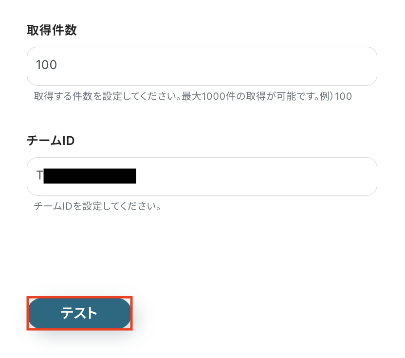 それぞれ入力が完了したら「テスト」をクリックして、設定した内容でSlackのパブリックチャンネル一覧が取得されるか確認しましょう。