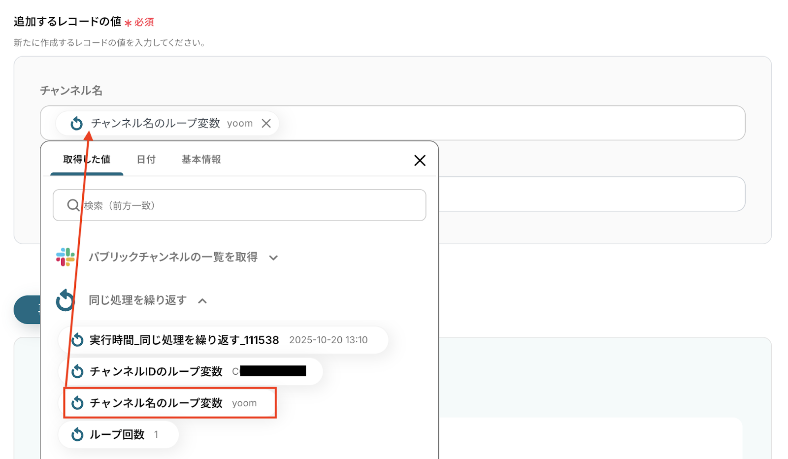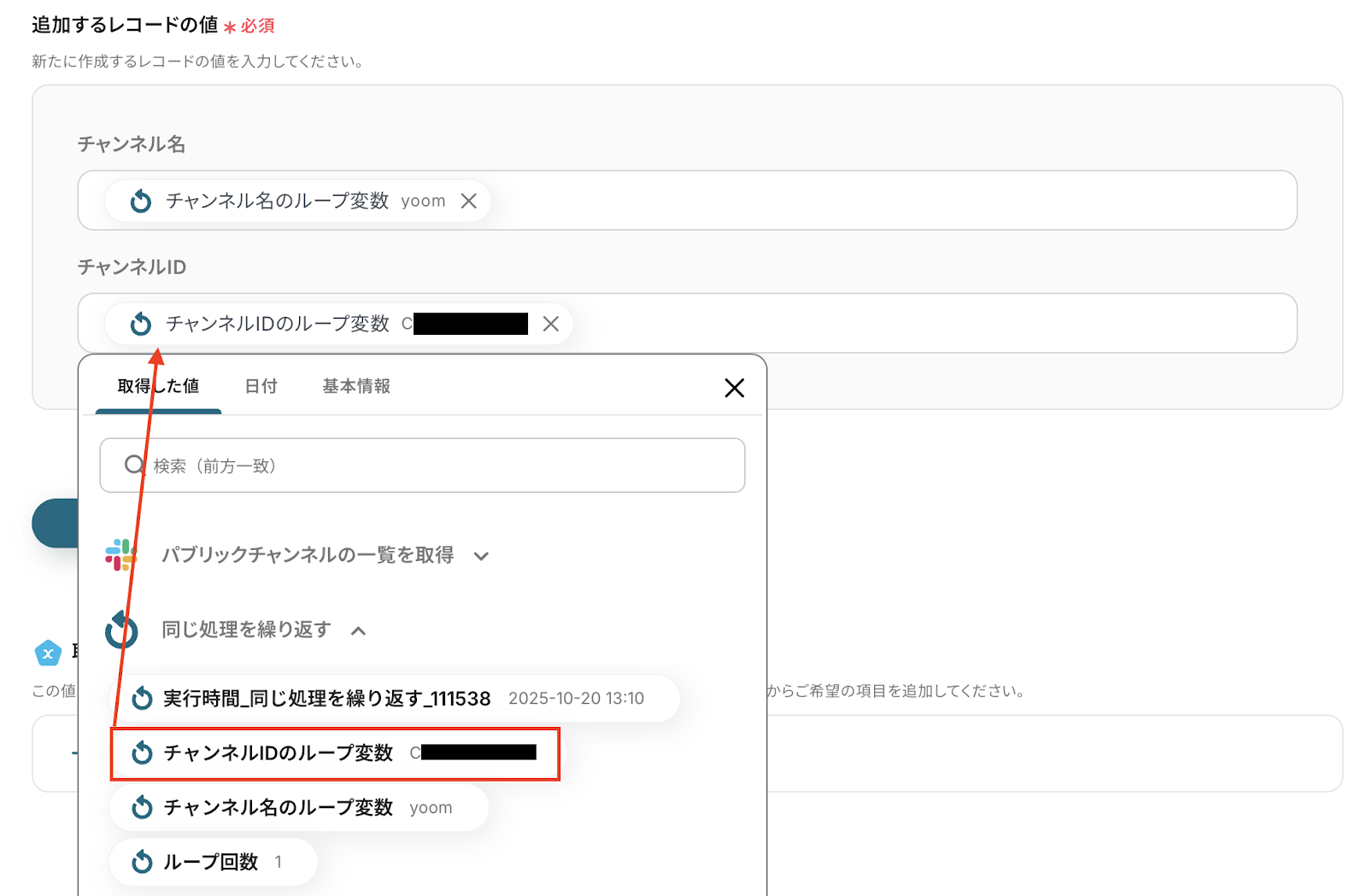 入力欄をクリックすると、前のステップ「同じ処理を繰り返す」から取得した値が表示されるので選択して入力しましょう。