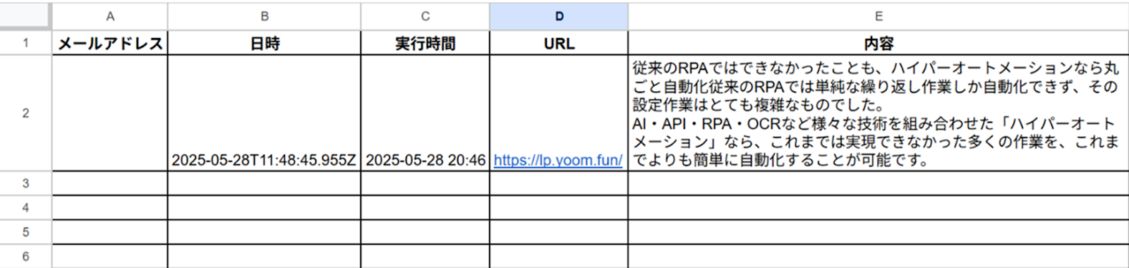実際にフローボットを起動して、Googleフォームから送信されたURLをスクレイピングし、ニュースの情報がGoogle スプレッドシートに追加されているか確認してみてくださいね!