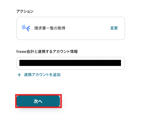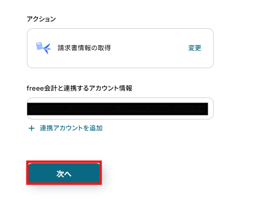 アクションは変更せず、アカウント情報がマイアプリ連携をしたアカウントと一致することを確認したら、「次へ」をクリックします。