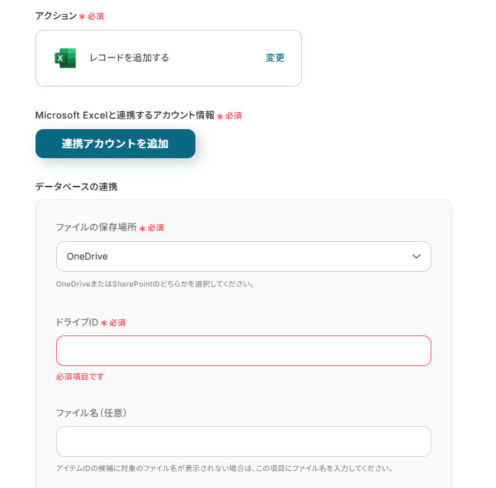 続いてドライブIDとアイテムID、シート名を入力します。