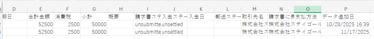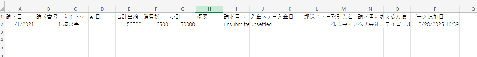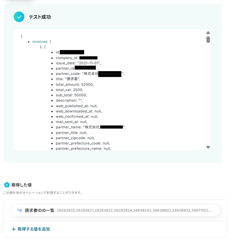 請求日、取引先、金額、ステータスなどが取得できます。取得した値に含まれていない場合は、「取得する値」を追加する方法 をご確認いただき、追加してください。