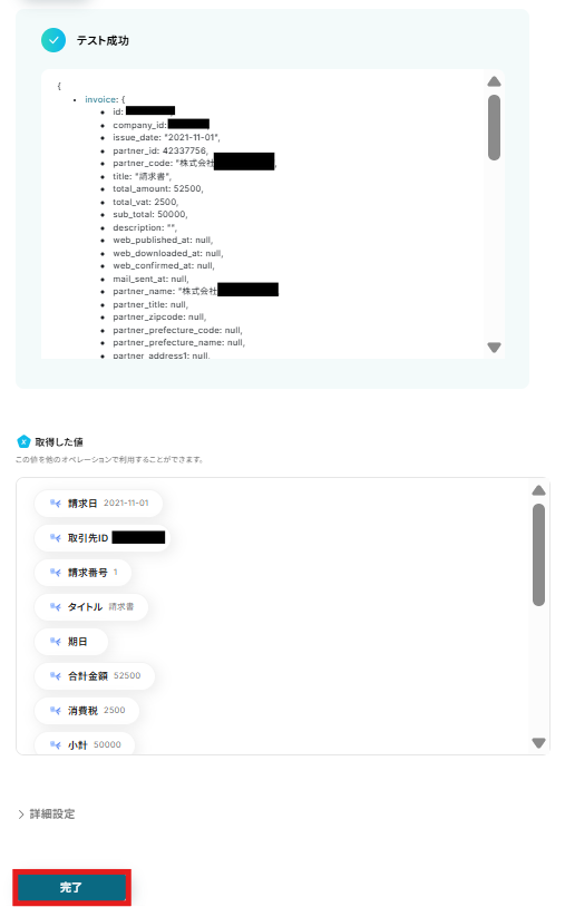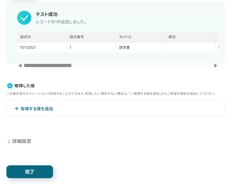 テストに成功すると、取得した値に取得した情報が追加されます。取得した値の内容が確認できたら、「完了」をクリックしてください。