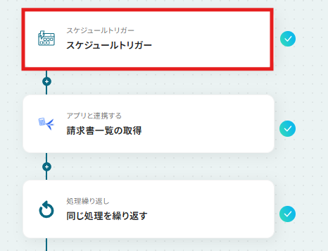 詳しい設定方法はスケジュールトリガーの設定方法をご確認ください。入力が完了したら、「完了」をクリックします。ステップ4:請求書の一覧を取得するアクション設定