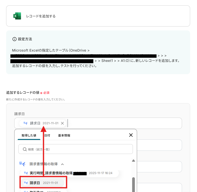 ・取引金額:③で取得した合計金額のアウトプットを埋め込みます。