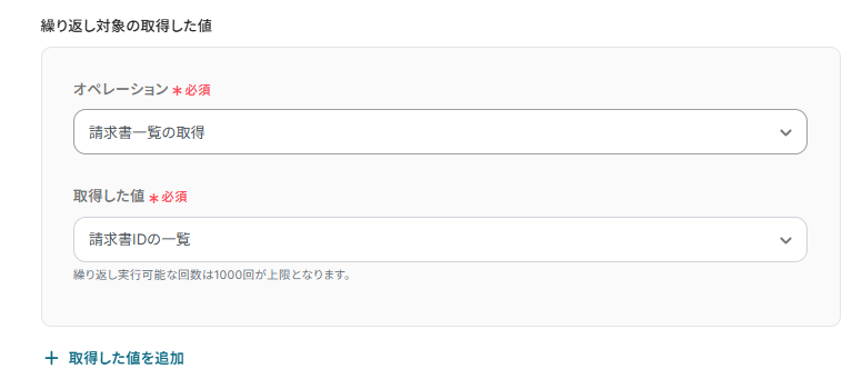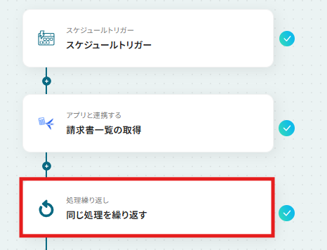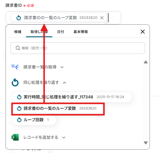ここでは、請求書IDの一覧を繰り返し取得するように設定します。