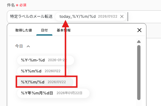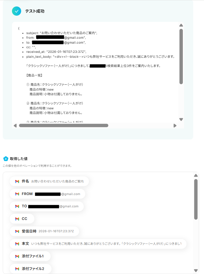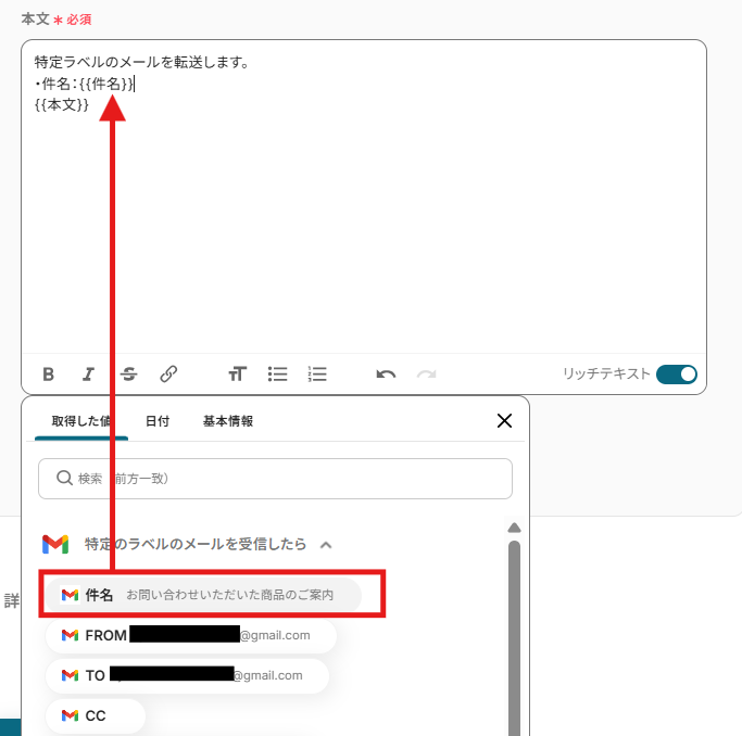 本文にはすでに以下のように取得した値を活用した例文が設定してありますが、「←Gmailのアウトプットを設定してください」は削除してください。