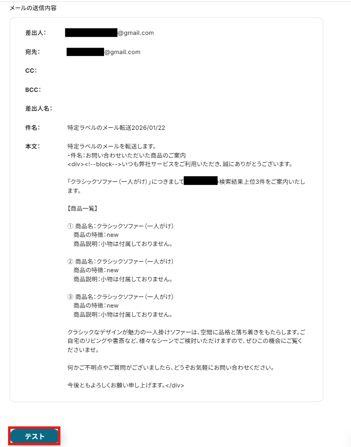 ※送信先にはテストメールが実際に送信されるので、ご注意ください。
