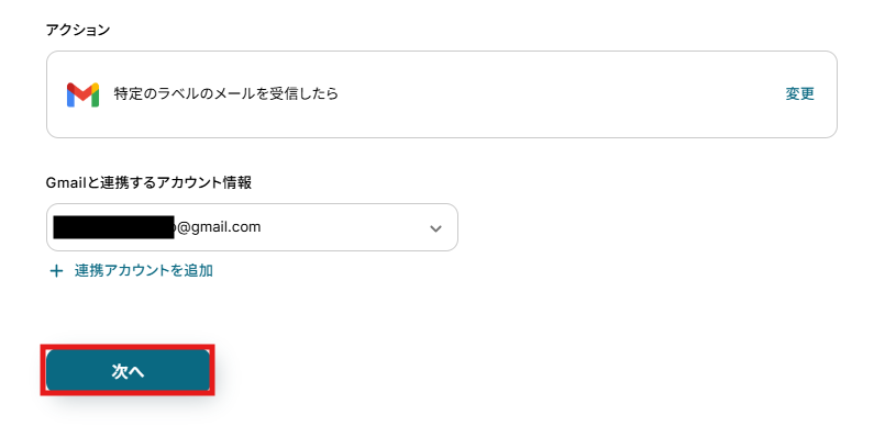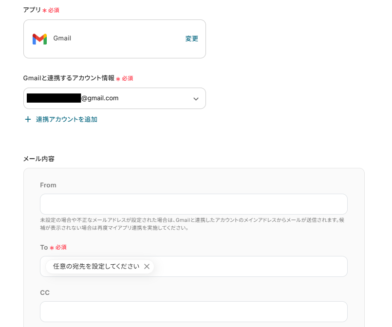 アクションは変更せず、アカウント情報がマイアプリ連携をしたアカウントと一致することを確認したら、メール内容を設定します。