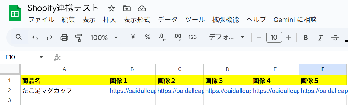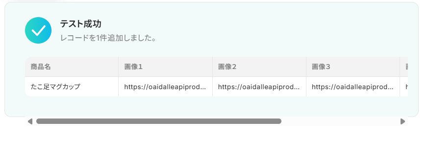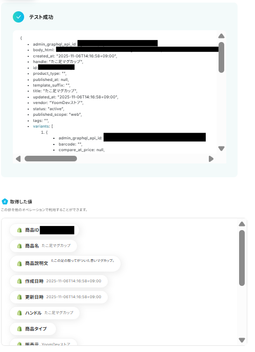 テストが成功すると取得した値の横に、Shopifyで作成した商品情報が表示されます。
