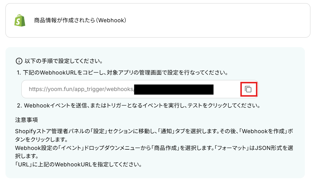 まずはShopifyのアクションをYoomに連携するために、Webhookの設定を行います。