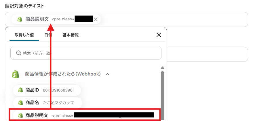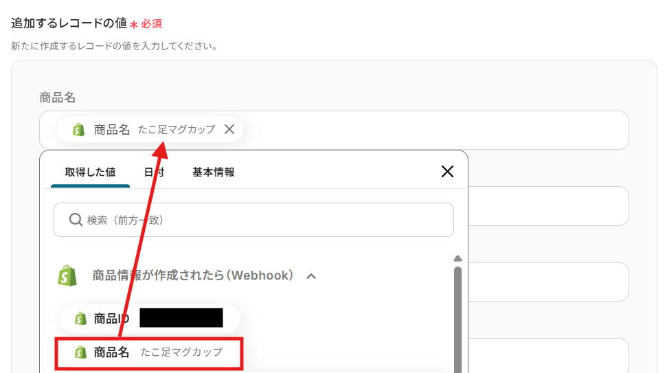 編集欄をクリックし、「商品情報が作成されたら(Webhook)」からShopifyで作成した商品情報を引用することができます!