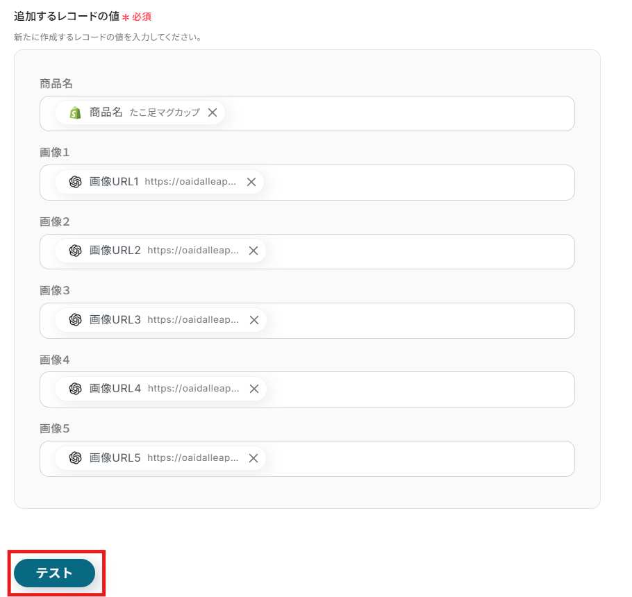 商品の作成が完了したら、Yoomの操作画面に戻り、「テスト」をクリックしてください。