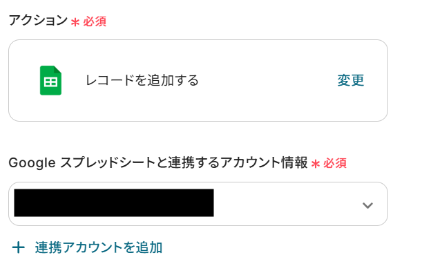 アクションは、「レコードを追加する」のままで次に進みましょう!