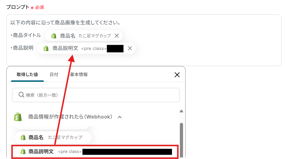 4.編集欄をクリックして、「商品情報が作成されたら(Webhook)」から、商品説明を選択します。