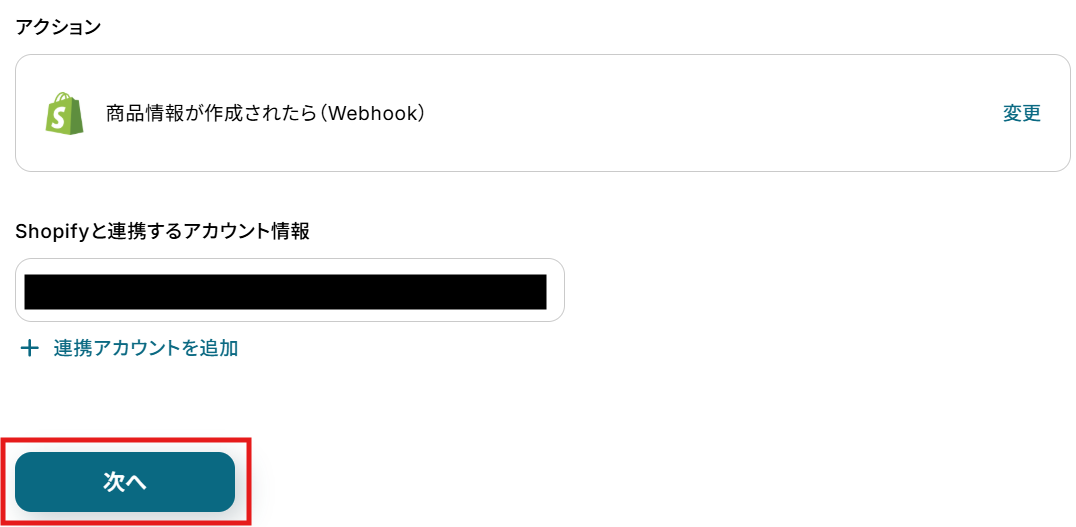 トリガーアクションは、「商品情報が作成されたら(Webhook)」のままで次に進みましょう!