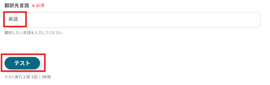 5.翻訳先言語を「英語」に設定し、「テスト」を実行してください。