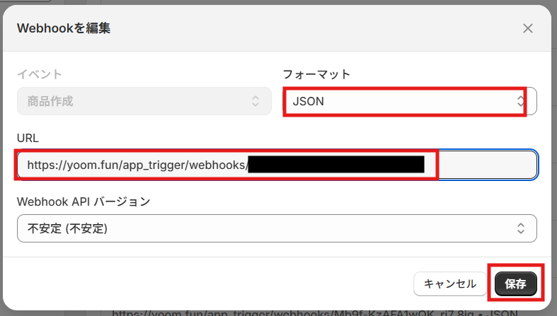 Yoomの操作画面からコピーしてきたWebhookURLを、URL欄に貼り付け、「保存」をクリックします。