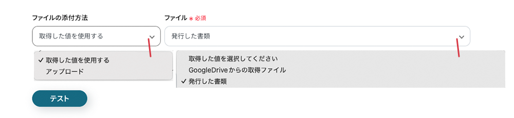 ファイルの添付方法 前の工程で取得したファイルの取得方法を指定します。