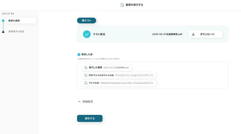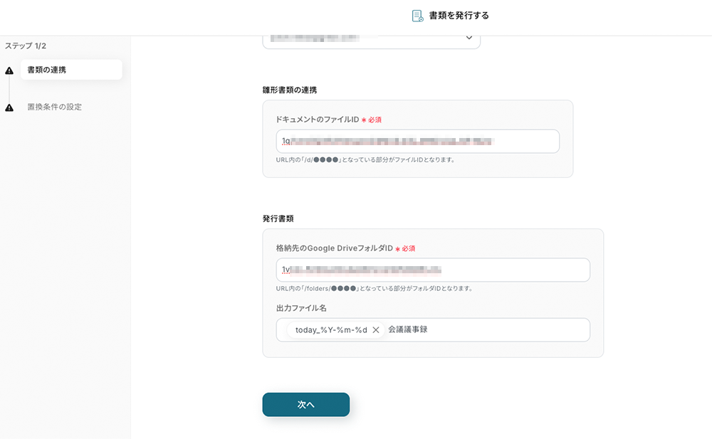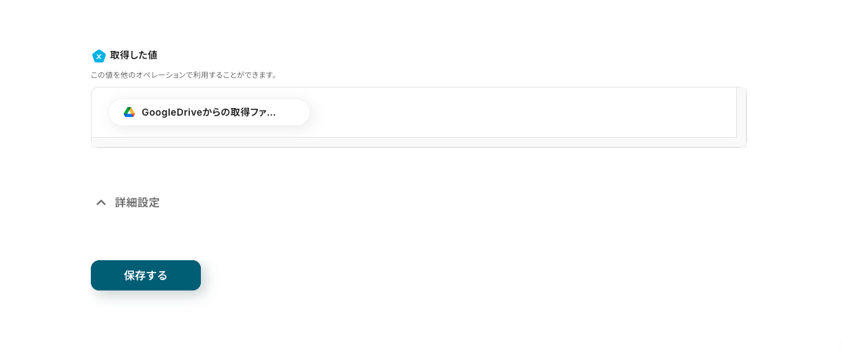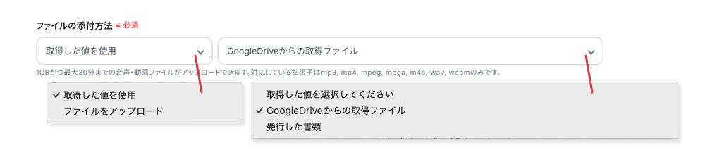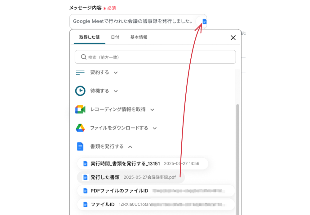 ファイルID 事前設定で前の操作で取得したファイルIDの引用コードが埋め込まれているため、追加の操作は不要です。ちなみに、この引用コードは編集欄をクリックしたら表示されるプルダウンメニュー内に格納されています。