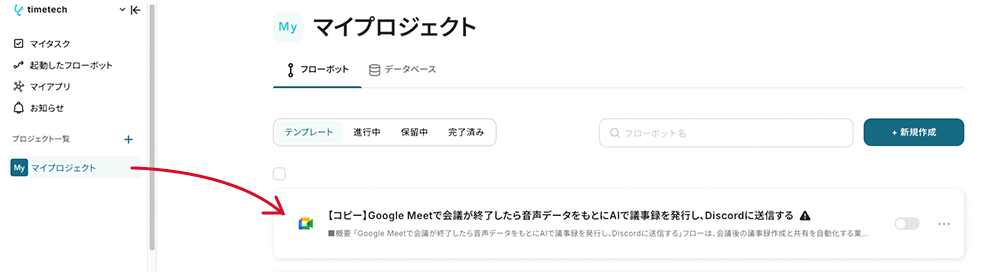 コピーしたテンプレートは、マイプロジェクトに追加されます。マイプロジェクトは左のメニューバーからアクセス可能です。