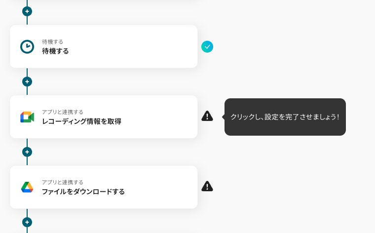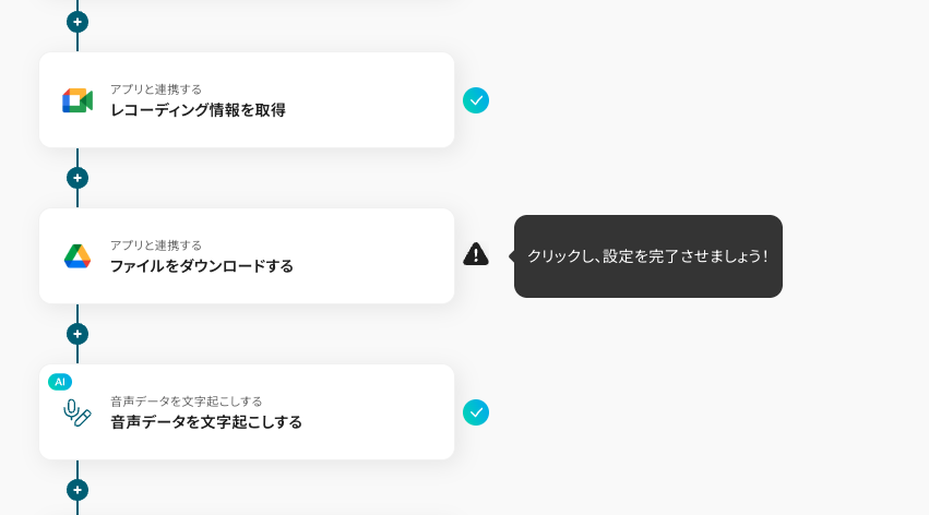 テンプレートの4つ目をクリックします。この工程では、前の工程で取得したレコーディング情報を使って、Google Driveからレコーディングファイルをダウンロードする設定を行います。