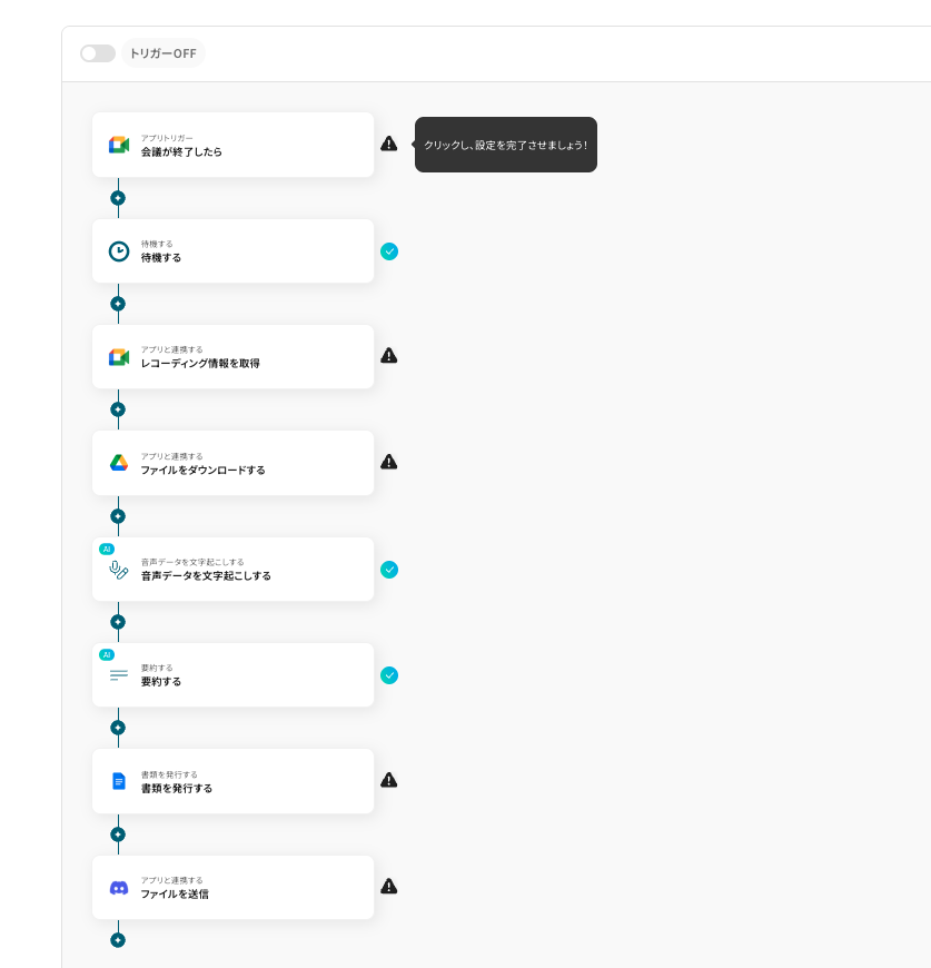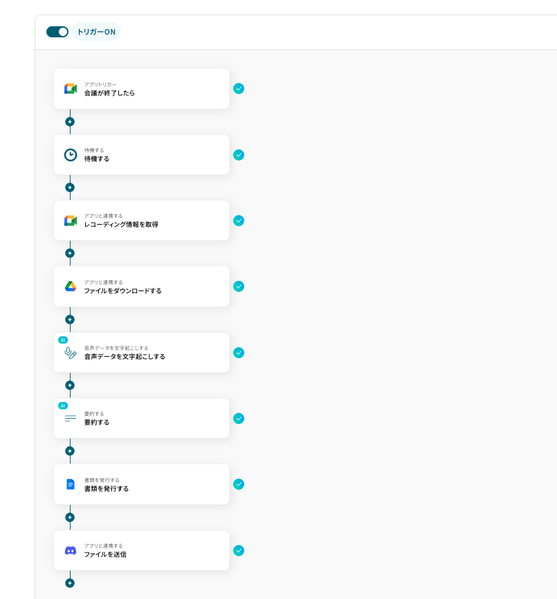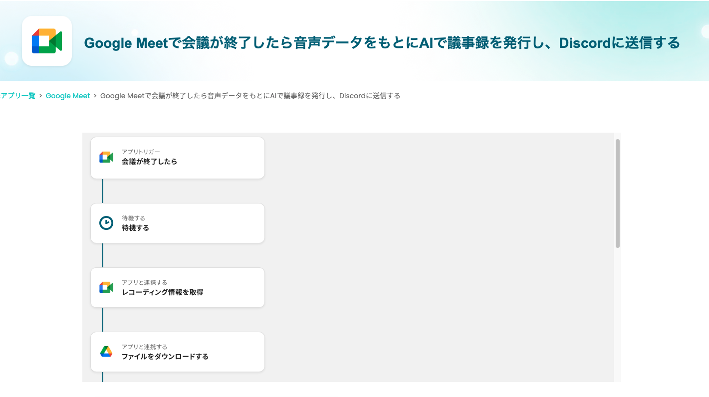 それではここから代表的な例として、Google Meetでの会議が終了した際に、その音声データをもとにAIが議事録を自動で作成し、その内容をDiscordへ通知するフロー を解説していきます!