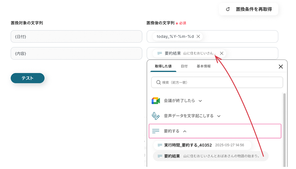 フィールドをクリックして、表示されたメニューから要約結果の引用コードを埋め込みます。設定ができたらテストをクリック します。