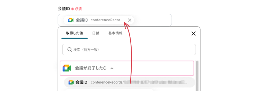 会議ID 事前設定で会議IDの引用コードが埋め込まれているため追加の設定は不要です。ちなみに、このコードはフィールドをクリックすると表示されるプルダウンメニューの中から選択できます。
