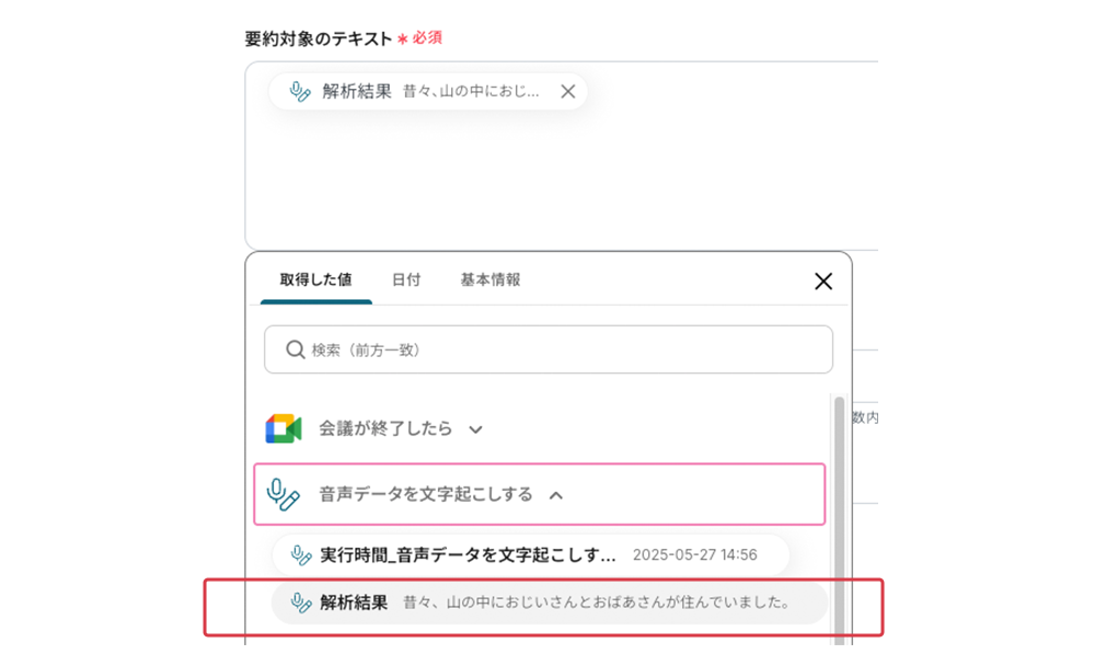 要約対象のテキスト 事前設定で、前の工程で取得した文字起こし結果の引用コードが埋め込まれています。指示文(←音声文字起こしのアウトプットを〜)を削除してください。この引用コードもプルダウンメニュー内から選択可能です。