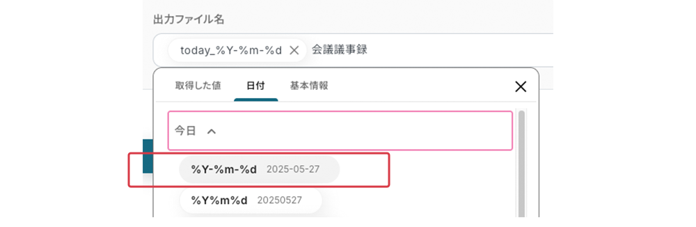 出力ファイル名 ファイル名のルールを設定します。重複しないように日付の引用コードを使います。