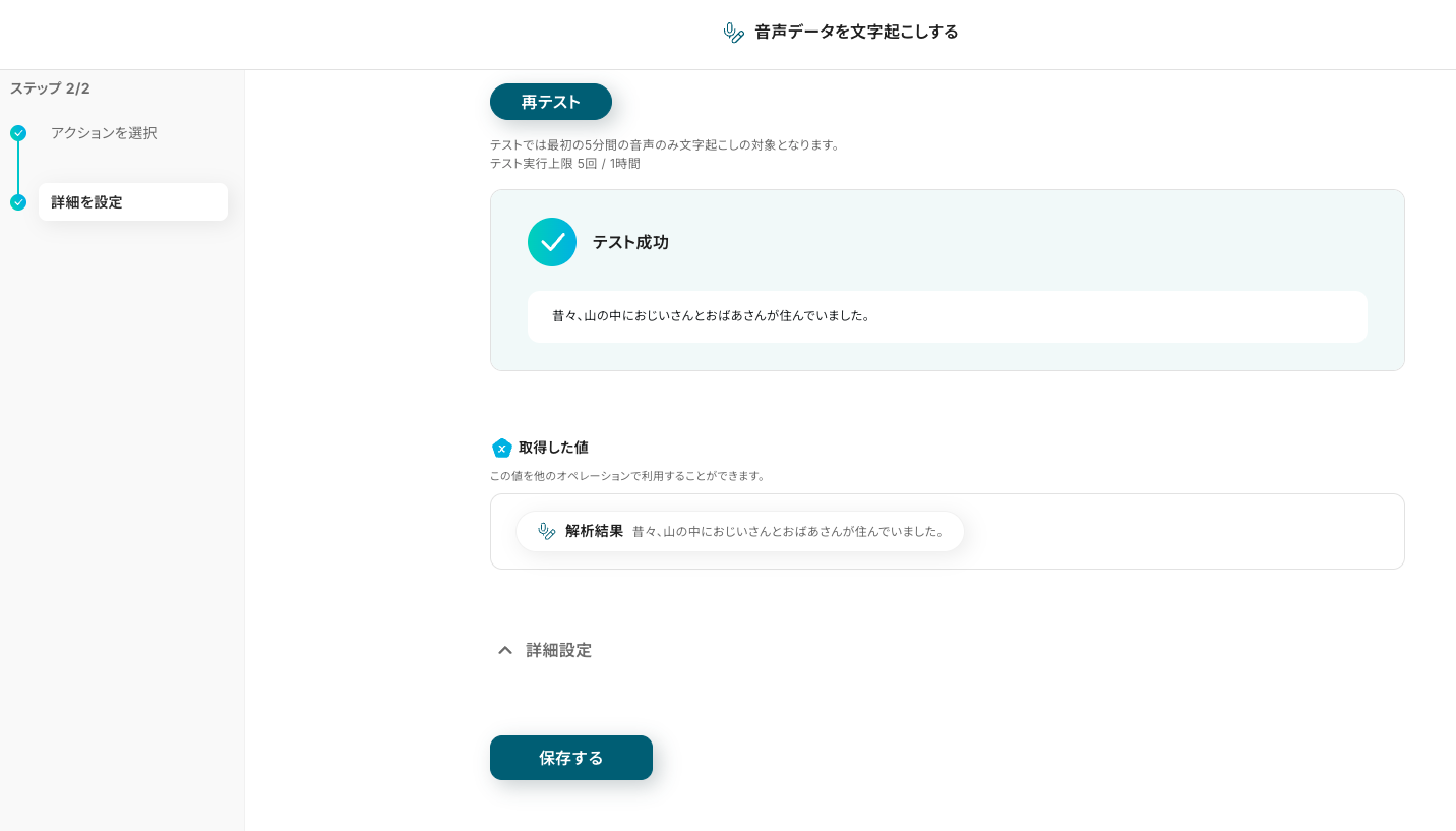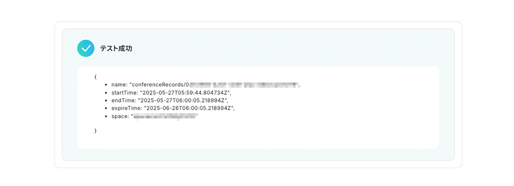 設定を確認したら、テストボタンをクリック します。成功すると、レコーディング情報が取得できます。