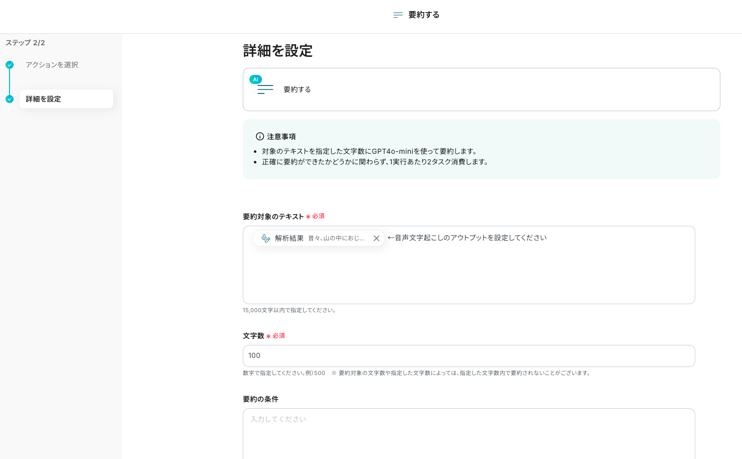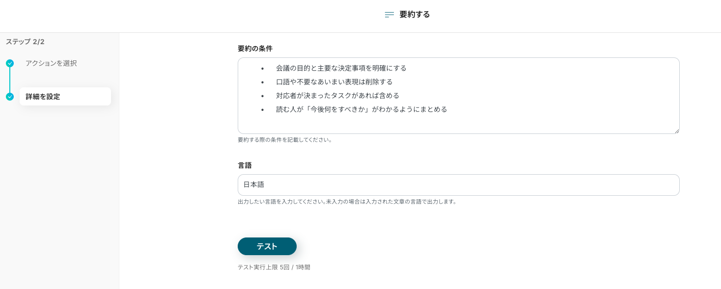 要約の条件 今回のフローは「会議終了後にAIで議事録を作成しDiscordへ送る」目的ですので、以下のような要約条件が適しています。
