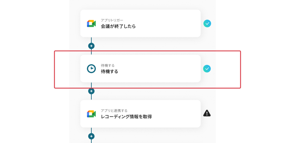 テンプレートの2つ目の工程をクリックします。設定済みの証(水色のアイコン)が点灯していますが、追加設定のため開きます。Google Meetの録画が終了すると、すぐに「会議終了」のトリガーは発動されますが、録音ファイル(mp4や音声ファイル)の生成には数秒〜数分のラグが発生することがあります。Google Meetのレコーディングファイルが確実に利用可能になるまで待つため待機時間を設定します。