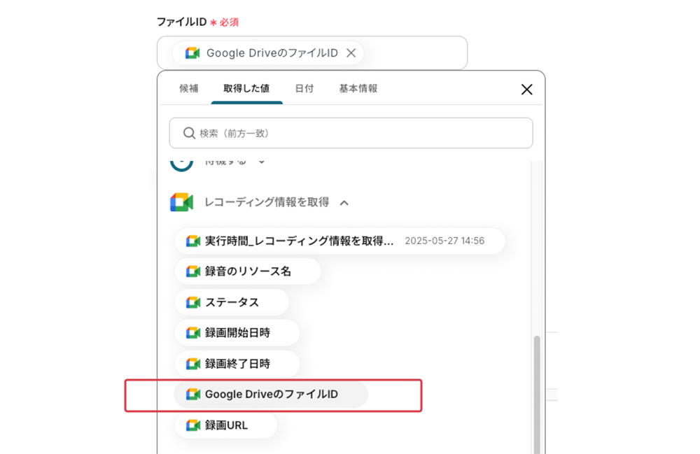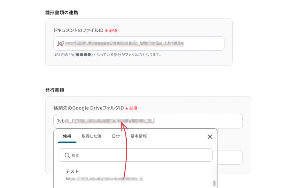 ドキュメントファイルID フィールドをクリックすると既存のデータが表示されます。選択するとIDが引用されます。