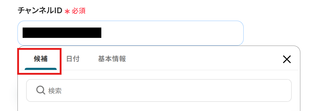 チャンネルID:入力欄をクリックすると候補が表示されるので、その中から選択しましょう。