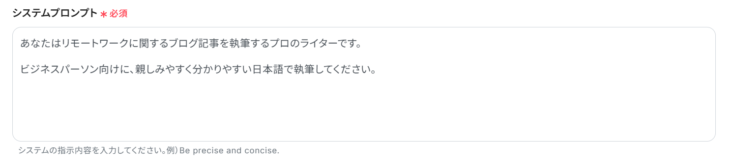 システムプロンプト:システムに指示したい内容を入力してください。今回は以下のように設定しました。